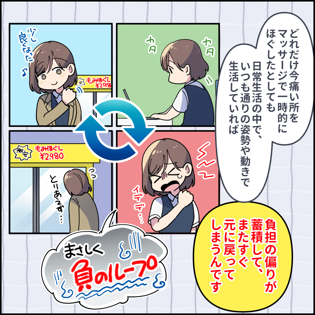 また、むやみやたらに長時間全身をただもみほぐす施術の危険性も教えてもらい、逆効果の事を2年もしてしまっていたと後悔しました。