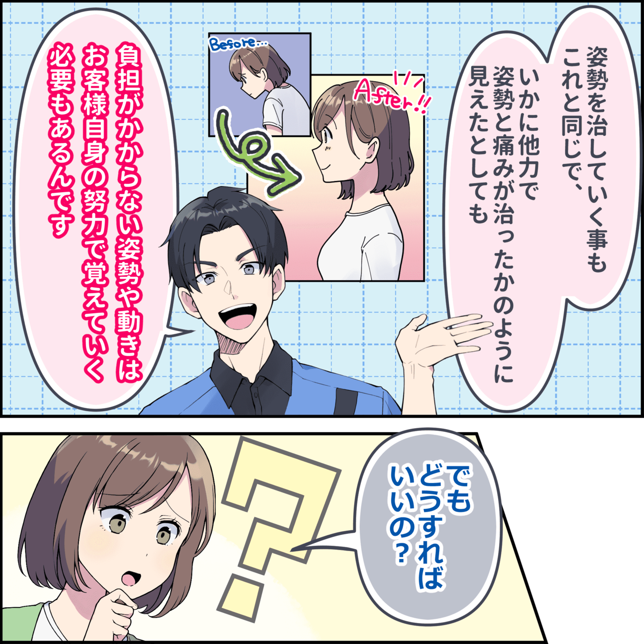 また、分析もしないまま安易に長時間腰をひたすら揉むような施術の危険性も教えていただき、自分の判断を後悔しました。
