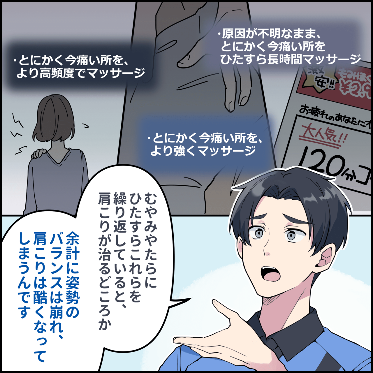 残念ながら、むやみやたらに長時間体をもみほぐすだけの施術を受けるのは逆効果です。
