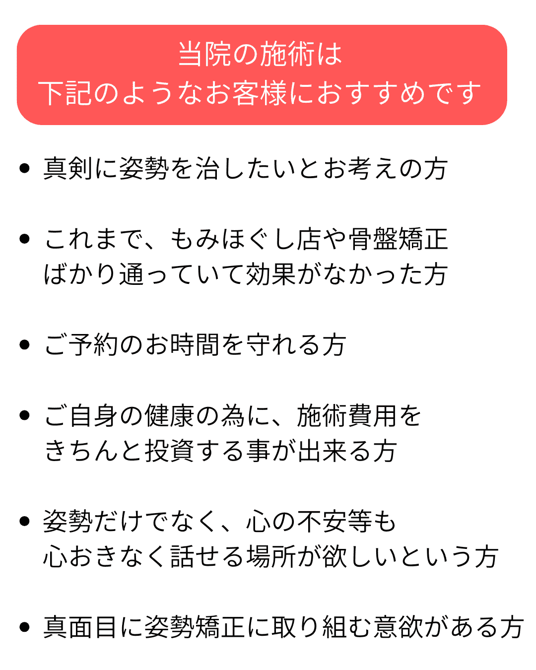 重度の姿勢矯正の方、中長期かけて姿勢の根本改善をご希望の方、一時的ではなく根本的に姿勢を改善させたい方向け