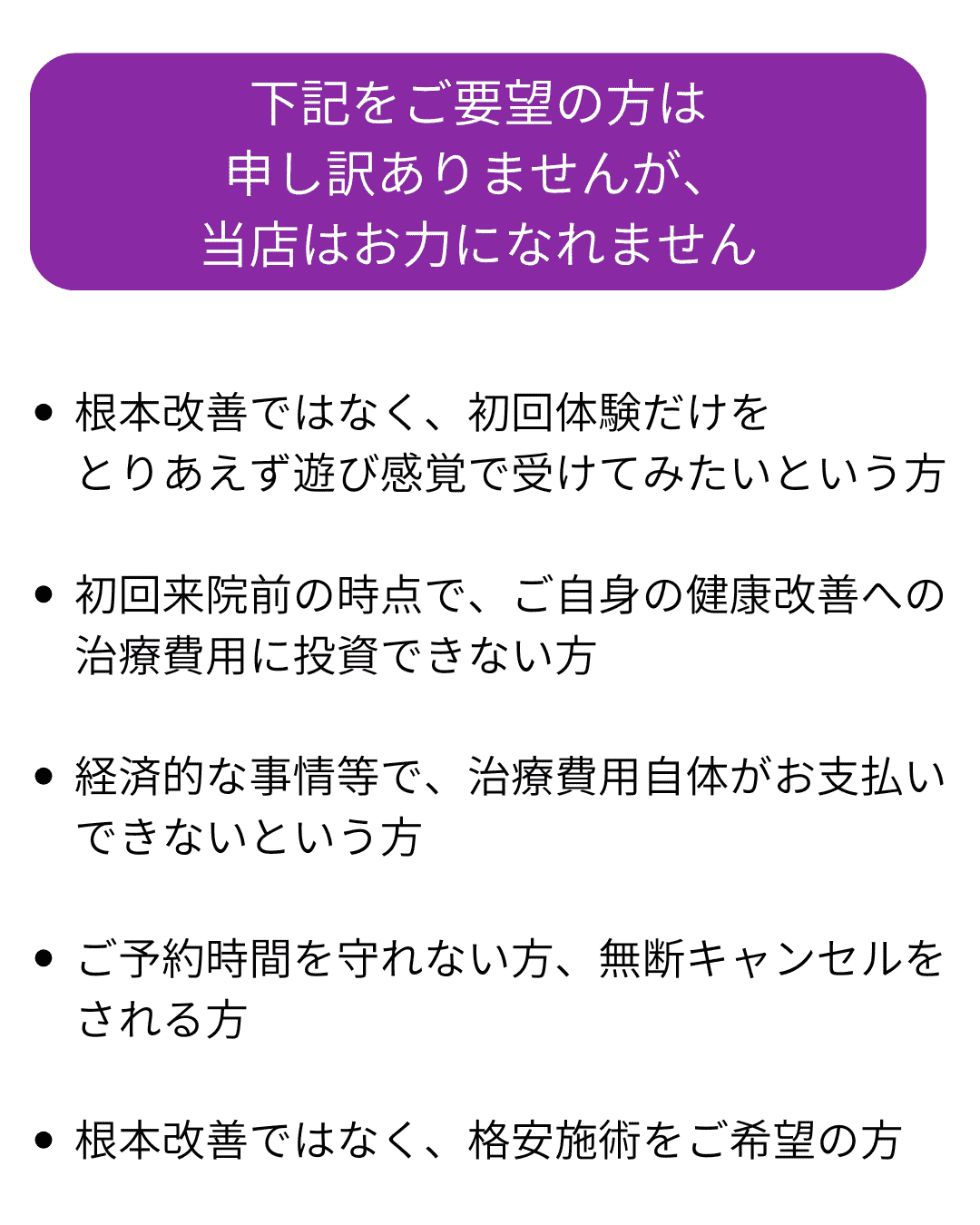 また、ベッド、枕、サプリメント、化粧品販売といった物販も行っておりません。安心してご来院ください。